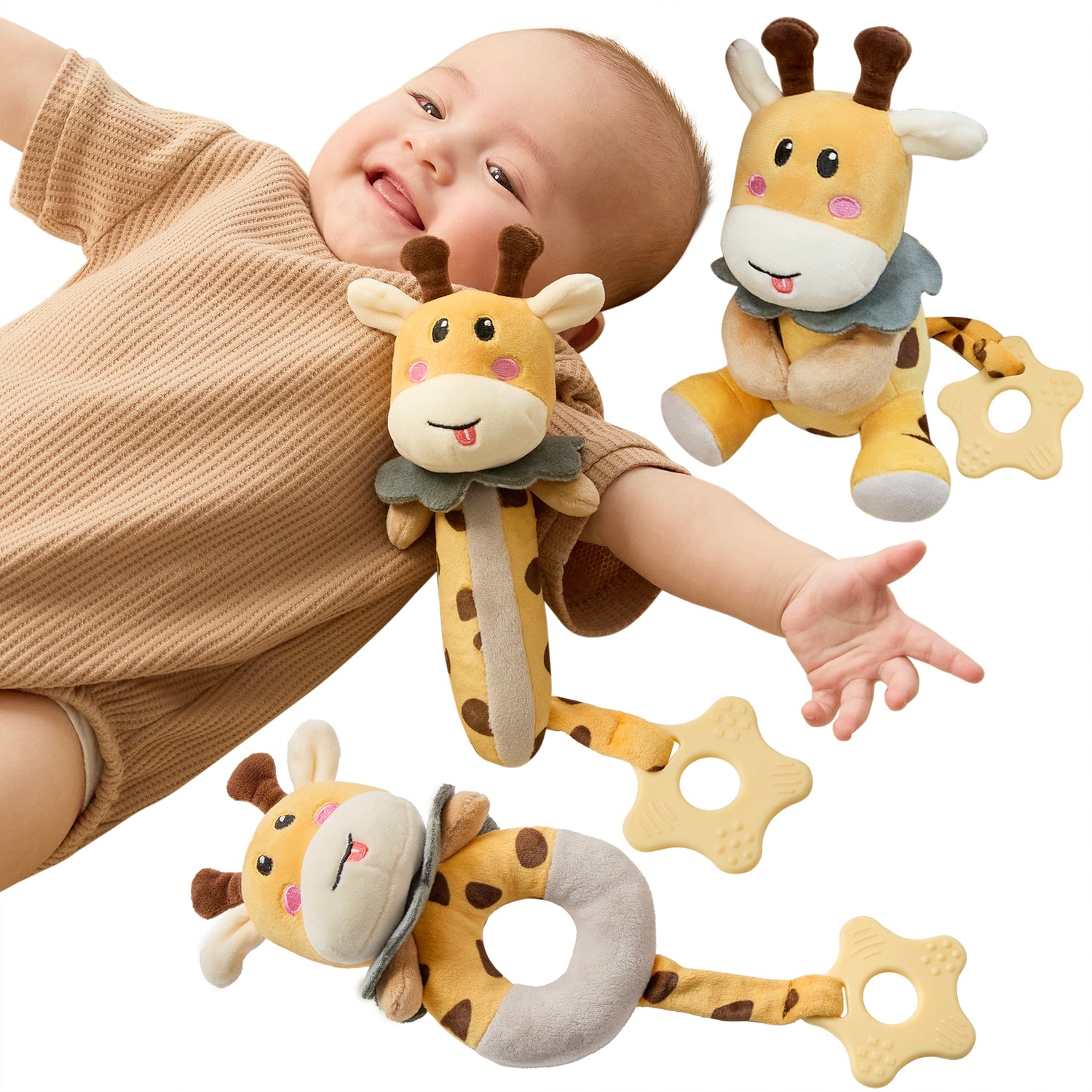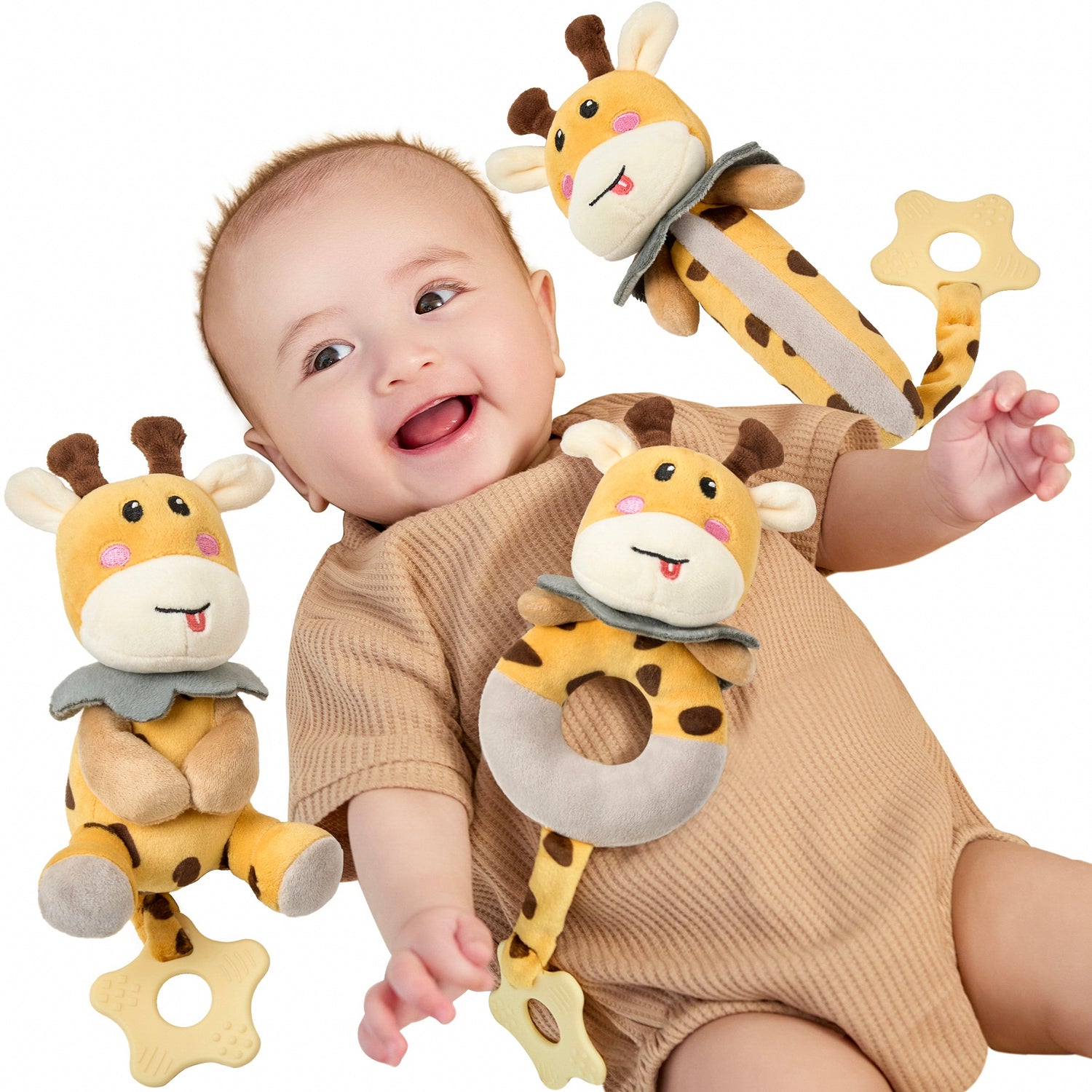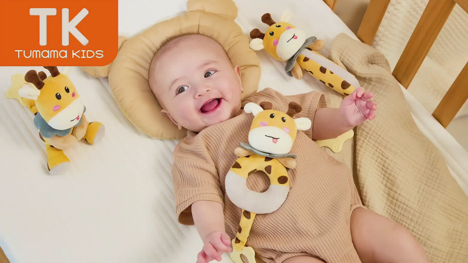 キリンの可愛い動物のぬいぐるみ/ラトルは、赤ちゃんがしっかりと掴める大きなサイズでそれぞれの動物には歯固め付き。歯固めは簡単に拭けて清潔に保つことができ、遊んで、噛んで、乳歯の成長をお手伝いします。